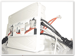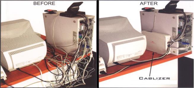 Компоненты Cablizer (Каблайзер), включают основную крышку, 2 заглушки, две полоски двухстороннего скотча, 4 прозрачных хомута многократного использования, 8 красных скоб (1 большую 1 среднюю и 6 маленьких). Каблайзер имеет четыре входа, для ввода и вывода кабелей. Исследования показали, что среднее число используемых входов 2-3, остальные, неиспользованные, закрываются заглушками. Основная крышка крепиться к корпусу четырьмя зажимами. Каблайзер комплектуется двумя полосками двухстороннего скотча, с помощью которых корпус изделия может быть закреплен на любой плоской поверхности. Использование полосок двухстороннего скотча помогает изменить положение Каблайзера в пространстве, что очень помогает при замене кабелей, а также, если пользователь захочет сделать их перекомпоновку. Конструкция Каблайзера предусматривает 3 вида проемов разной ширины, рассчитанных под соответствующую толщину кабеля. Также имеются 8 красных скоб, рассчитанных под соответствующую ширину проема, надежно фиксирующих провода в проемах. Скобы регулируются по высоте и плотно зажимают кабель в проеме. Хомуты многократного использования связывают кабели между собой, не дают им рассыпаться и поддерживают компактный вид, что позволяет убрать внутрь Каблайзера большее количество кабелей.